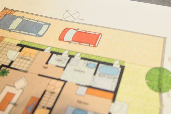 周囲の環境や地面の広さ、方角等を加えた図面に描き、入念な打ち合わせをして、間取りを決めます。