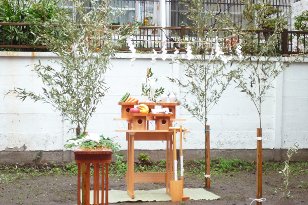(地鎮祭:土地に住んでいる神様を祝い鎮め、土地を利用させてもらう許可を得ること。工事の安全と家の繁栄を祈願すること。)